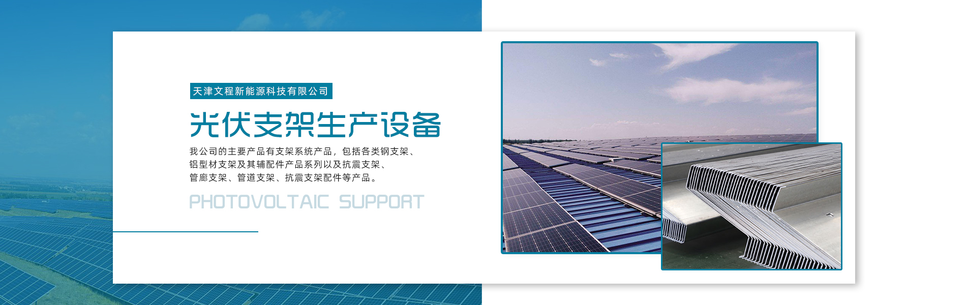 關(guān)于我們天津文程新能源科技有限公司成立于2021年,是專注于集中式、分布式、漁光互補(bǔ)和農(nóng)光互補(bǔ)等清潔能源發(fā)電的綜合性企業(yè) 公司是集設(shè)計(jì)、研發(fā)、生產(chǎn)、制造為一體的綜合型企業(yè)。公司占地面積20000平方米,注冊(cè)資金5000萬(wàn)元整。公司坐落于華北鋼鐵重鎮(zhèn)--大邱莊,距天津市區(qū)50公里、鄰104和205國(guó)道及京滬高速,交通十分便捷。 本公司擁有三個(gè)生產(chǎn)車間,其中兩個(gè)冷彎型鋼車間,一個(gè)鋅鋁鎂型鋼車間,擁有自動(dòng)冷彎成型機(jī)10條,自動(dòng)數(shù)控沖孔機(jī)10條以及焊接加工等設(shè)備。主要生產(chǎn)產(chǎn)品有:太陽(yáng)能光伏支架、各種規(guī)格的C/Z/U型鋼、抗震支架、管廊支架及整套配件等。